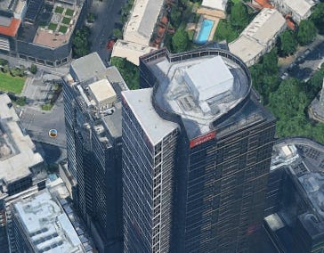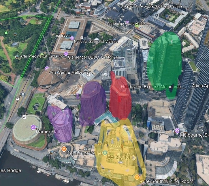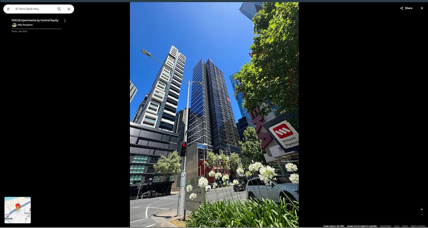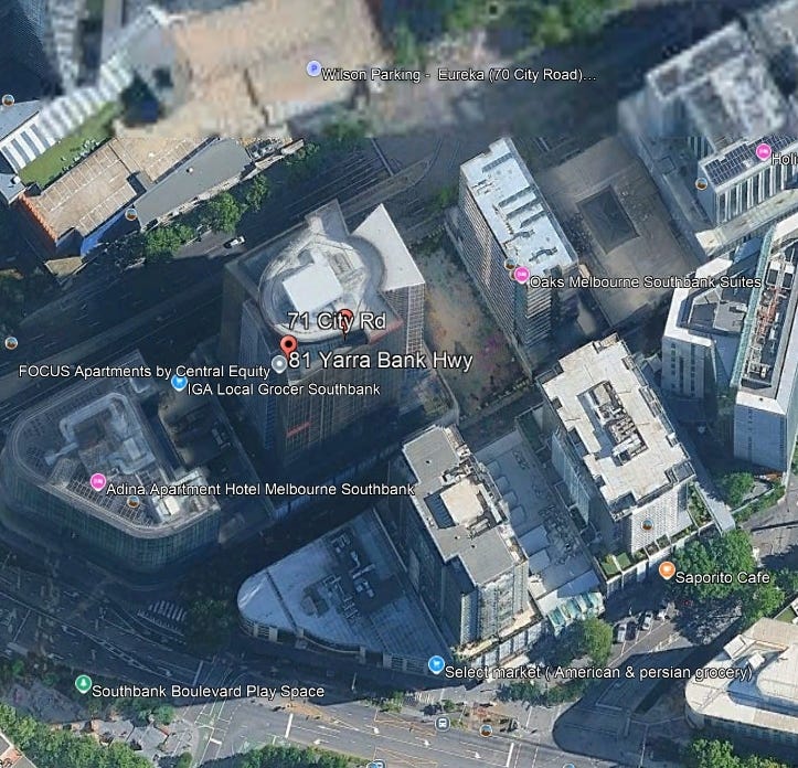 The "green building" (tallest structure) was geolocated using Google Earth and Street View to approximately "81 Yarra Bank Hwy". This way done by simply going to nearest the address on the map and looking at the building. Using image saved at the location from google photos it can be confirmed that this is the correct building.