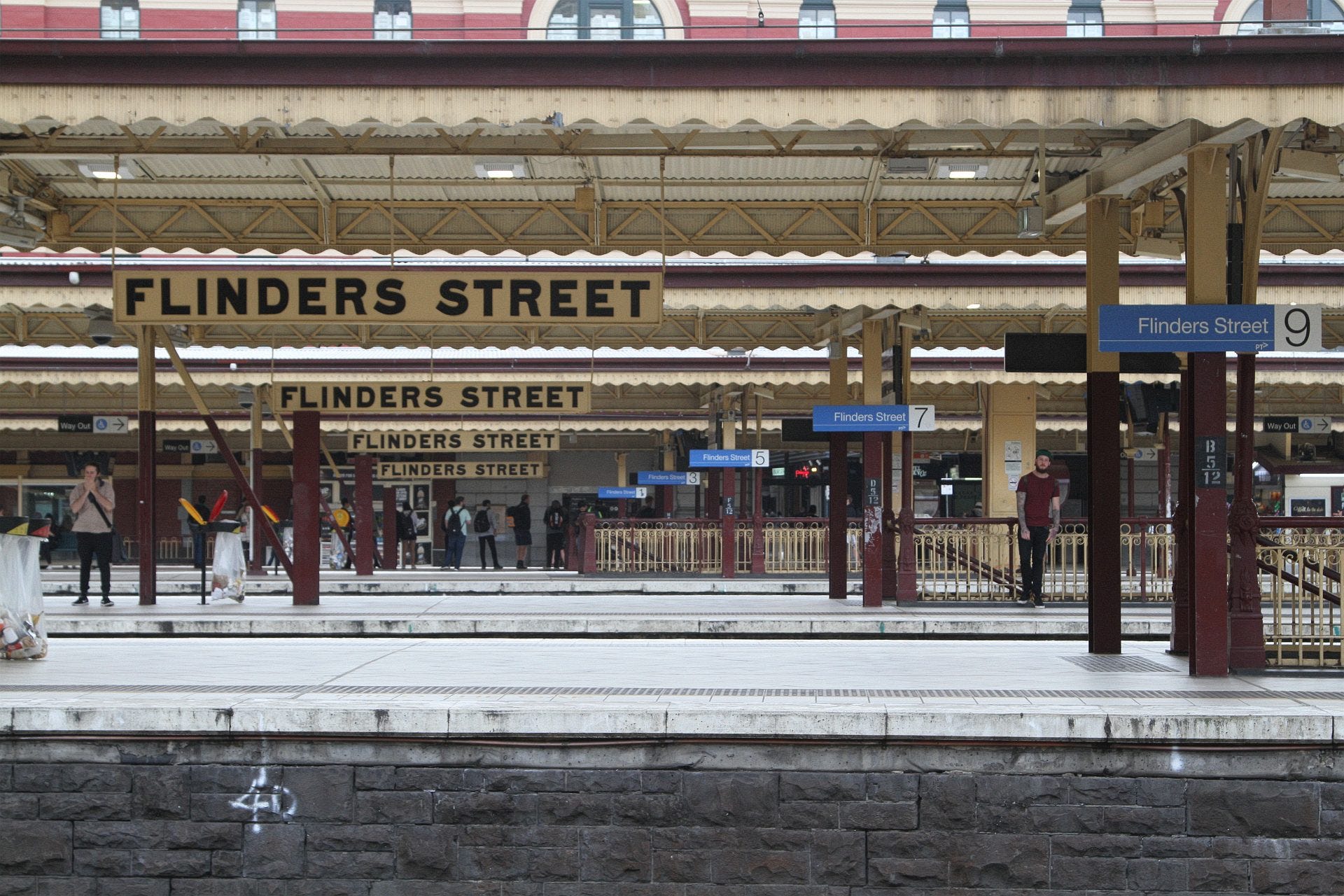 a) Signs within the station clearly displaying the name "flinders street". This was a strong initial lead for the station's name.