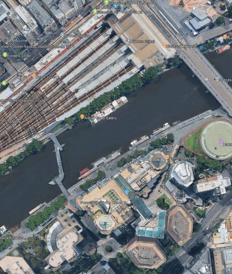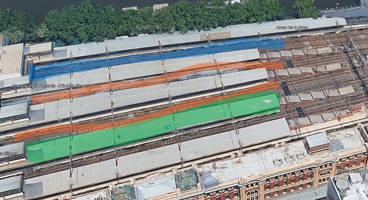 Estimating the Photographer's Likely Position: Based on the orientation in the original image and the layout of Flinders Street Station (platform numbers relative to the Yarra River), I deduced that the photograph was most likely taken from the 4th platform from the water. The map below illustrates my reasoning: Blue highlight = train in original image; Orange highlights = empty track sections; Green highlight = most likely platform.